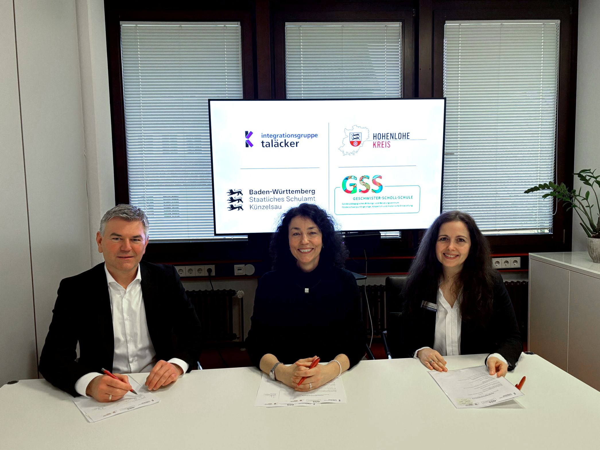 Landrat Ian Schölzel, Bettina Hey, Leiterin des Staatlichen Schulamtes in Künzelsau und Marion Hannig-Dümmler, stv. Hauptamtsleitung Fachbereich Frühkindliche Bildung und Integration der Stadtverwaltung Künzelsau, unterzeichneten die Vereinbarung zur Kooperation an der Geschwister-Scholl-Schule.