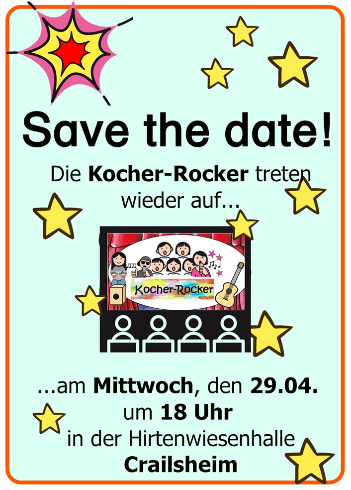 Die Kocher-Rocker treten wieder auf. Am Mittwoch, den 29.04., findet in der Hirtenwiesenhalle in Crailsheim ein Begegnungskonzert der Schulmusik statt. Alle teilnehmenden Chöre werden gemeinsam singen, aber auch ein siebenminütiges eigenes Programm aufführen.